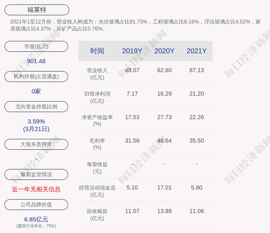 2021年1至12月份,福莱特的营业收入构成为:光伏玻璃占比81.73%,工程玻璃占比8.16%,浮法玻璃占比4.52%,家居玻璃占比4.37%,采矿产品占比0.76%。
