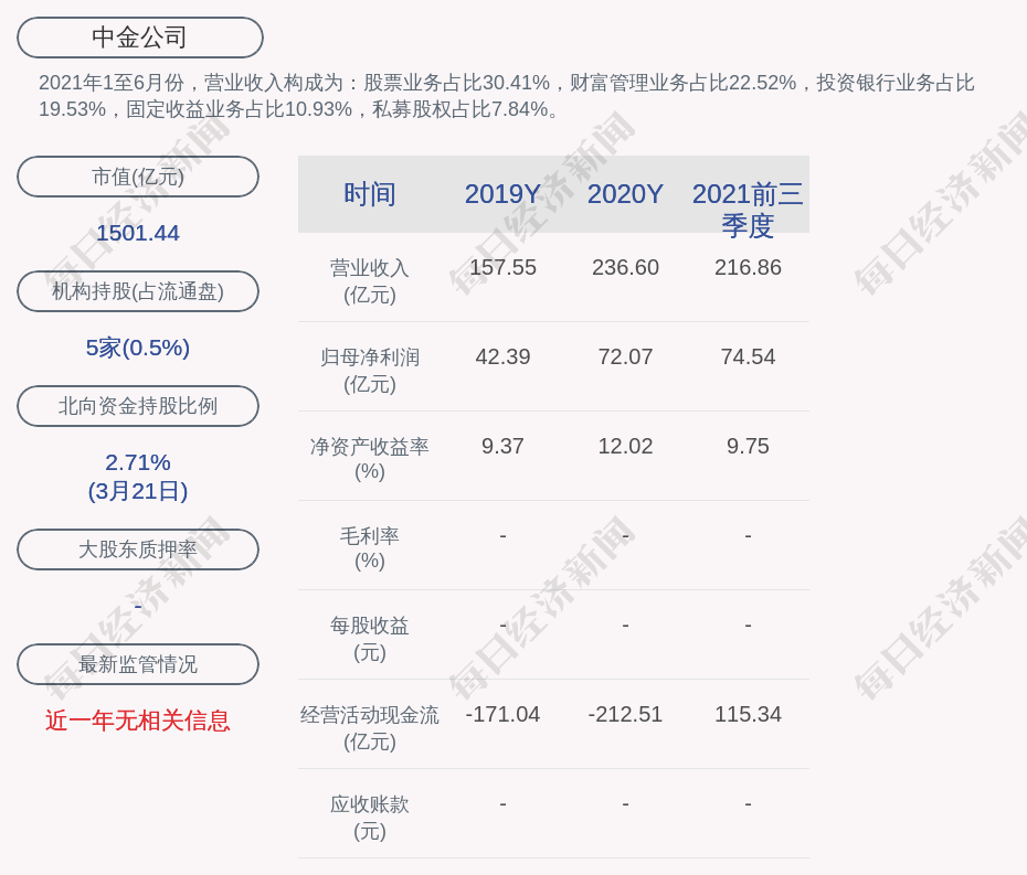 2021年1至6月份,中金公司的营业收入构成为:股票业务占比30.41%,财富管理业务占比22.52%,投资银行业务占比19.53%,固定收益业务占比10.93%,私募股权占比7.84%。