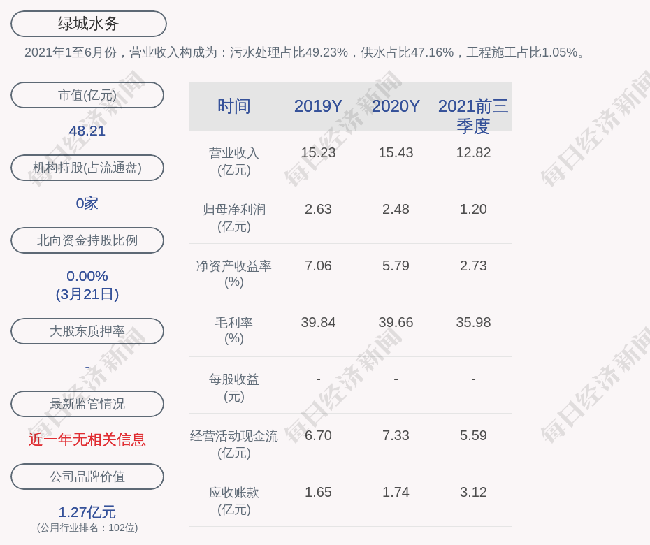 2021年1至6月份,绿城水务的营业收入构成为:污水处理占比49.23%,供水占比47.16%,工程施工占比1.05%。