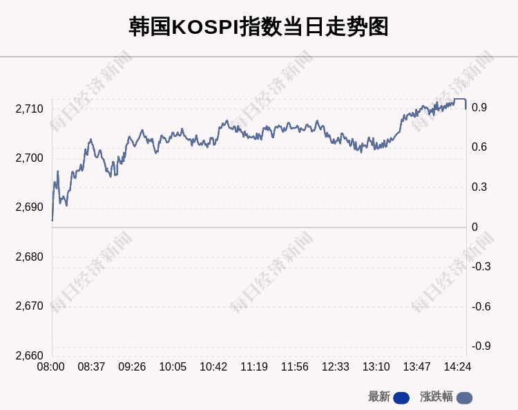 每经AI快讯:北京时间3月22日14:00,韩国KOSPI指数收盘上涨23.95点,涨幅为0.89%,报2710.0点。