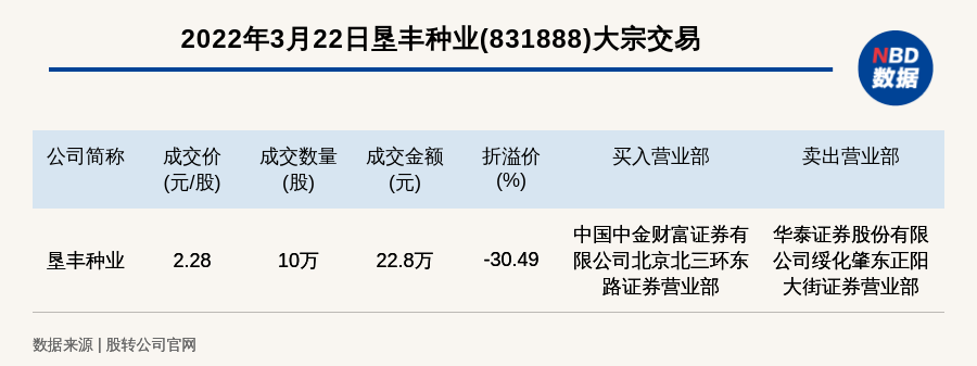 每经讯,2022年3月22日,新三板创新层公司垦丰种业(831888)发生一笔大宗交易,成交价2.28元/股,成交数量10万股,成交金额22.8万元,折价30.49%。买入营业部是中国中金财富证券有限公司北京北三环东路证券营业部,卖出营业部是华泰证券股份有限公司绥化肇东正阳大街证券营业部。