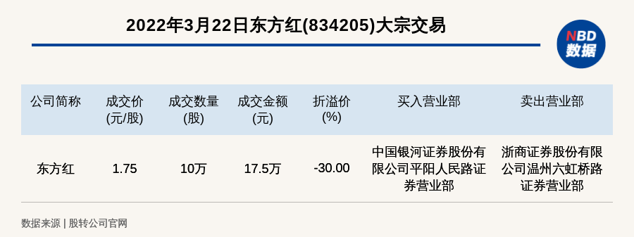 每经讯,2022年3月22日,新三板基础层公司东方红(834205)发生一笔大宗交易,成交价1.75元/股,成交数量10万股,成交金额17.5万元,折价30%。买入营业部是中国银河证券股份有限公司平阳人民路证券营业部,卖出营业部是浙商证券股份有限公司温州六虹桥路证券营业部。