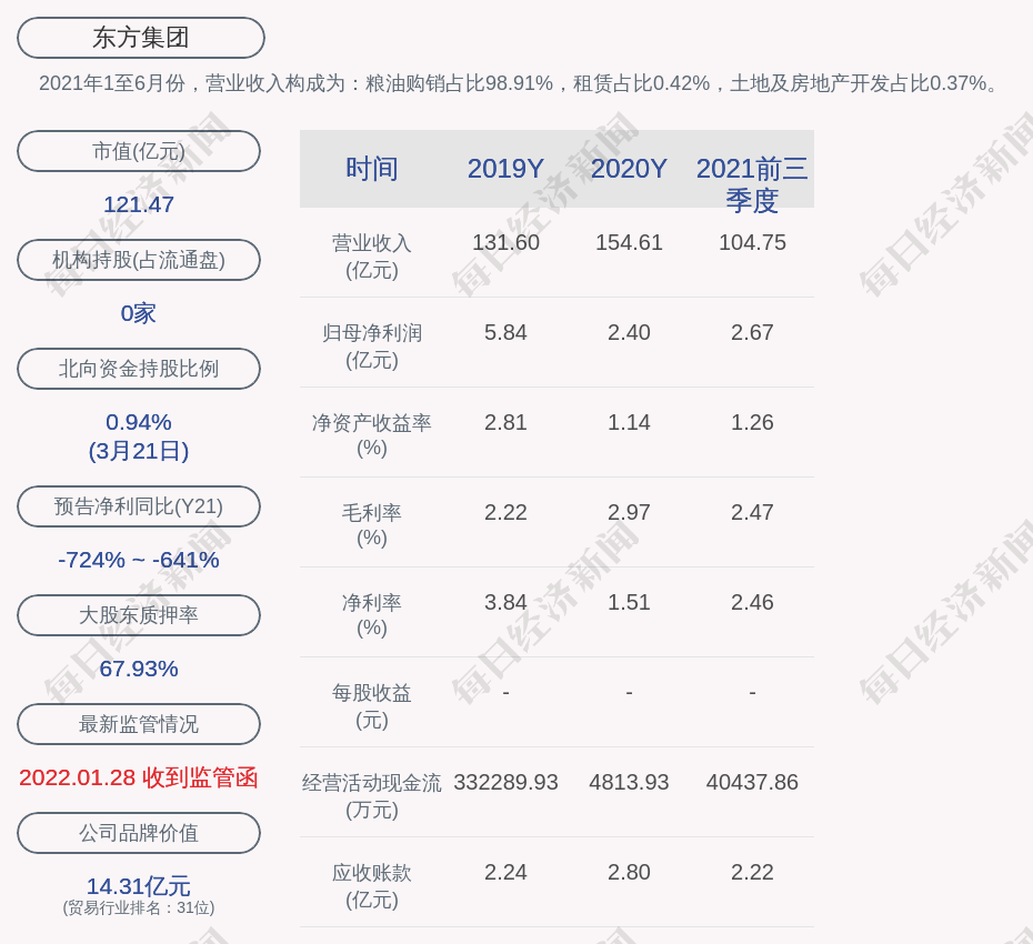 2021年1至6月份,东方集团的营业收入构成为:粮油购销占比98.91%,租赁占比0.42%,土地及房地产开发占比0.37%。
