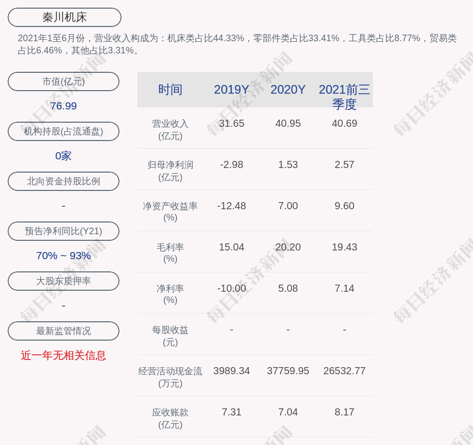 2021年1至6月份,秦川机床的营业收入构成为:机床类占比44.33%,零部件类占比33.41%,工具类占比8.77%,贸易类占比6.46%,其他占比3.31%。