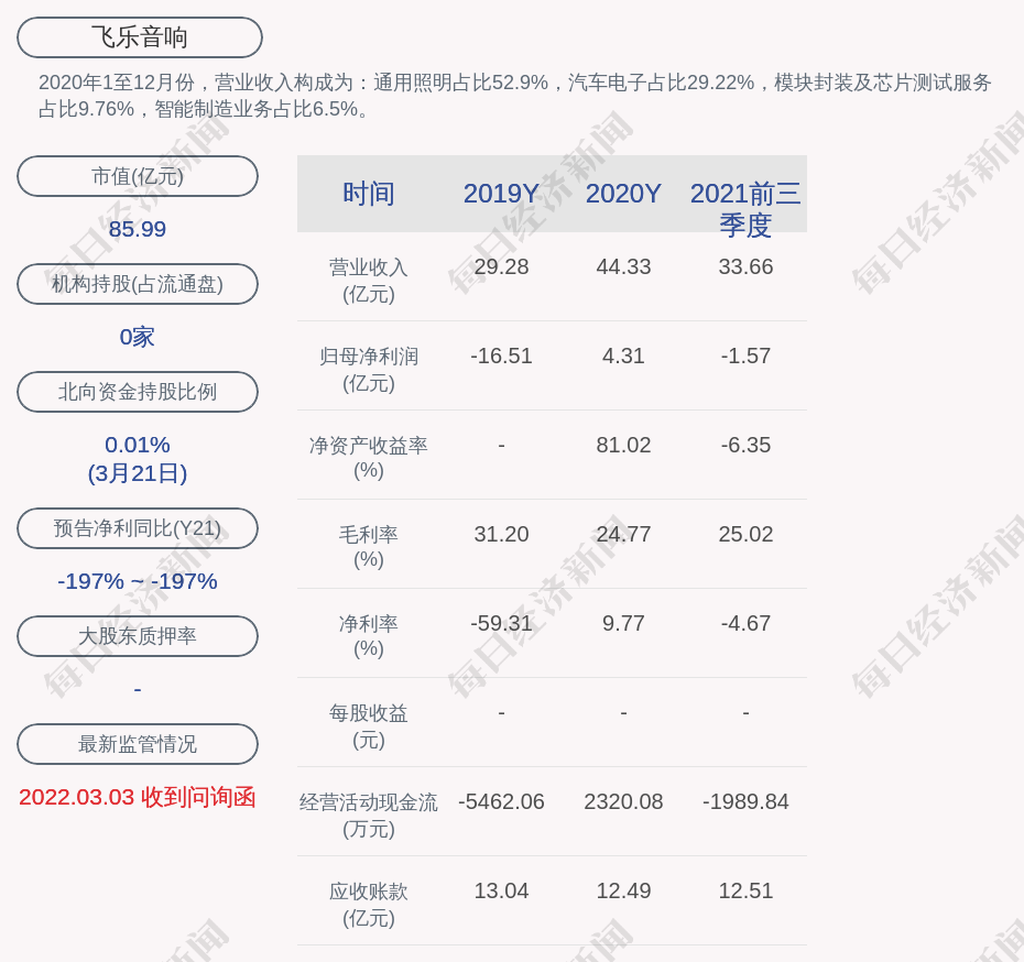 2020年1至12月份,飞乐音响的营业收入构成为:通用照明占比52.9%,汽车电子占比29.22%,模块封装及芯片测试服务占比9.76%,智能制造业务占比6.5%。