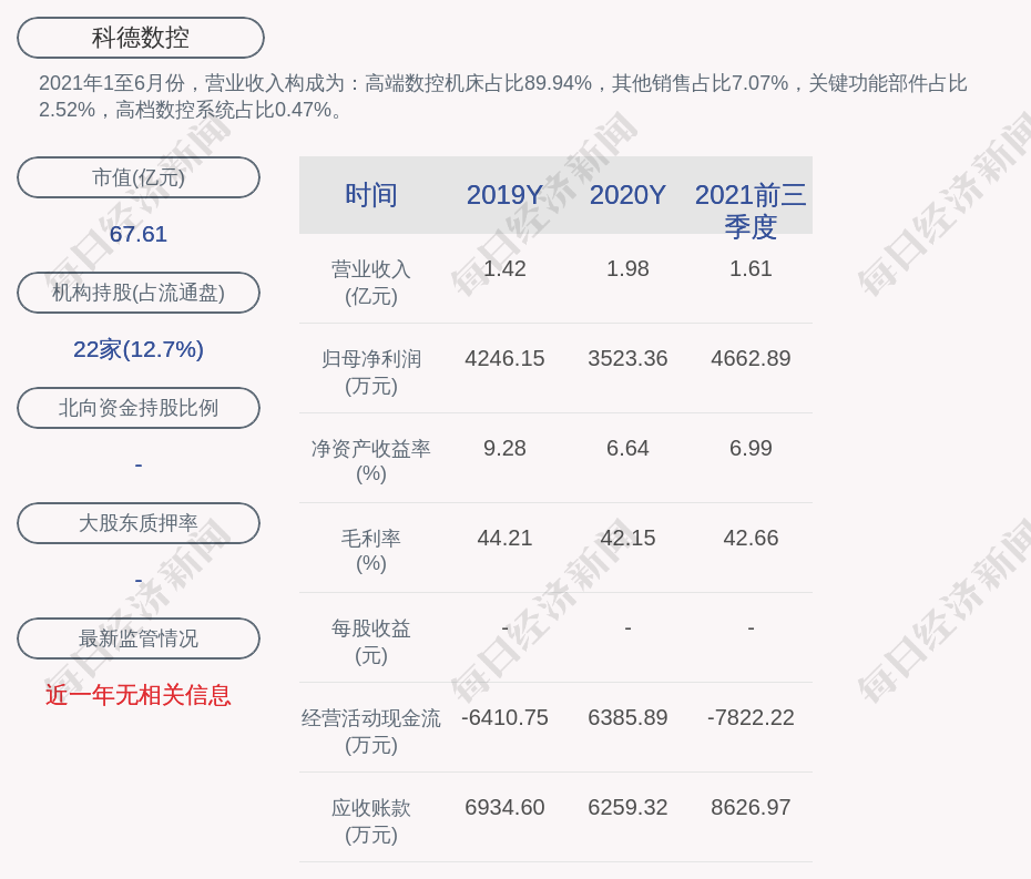 2021年1至6月份,科德数控的营业收入构成为:高端数控机床占比89.94%,其他销售占比7.07%,关键功能部件占比2.52%,高档数控系统占比0.47%。