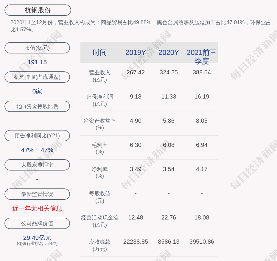 每经AI快讯,杭钢股份(SH 600126,收盘价:5.66元)3月23日晚间发布2021年度业绩快报,营业收入约499.62亿元,同比增加51.92%;归属于上市公司股东的净利润盈利约16.36亿元,同比增加43.95%;基本每股收益盈利0.48元,同比增加41.18%。本期公司处置了持有的浙江富春紫光环保股份有限公司的股权。