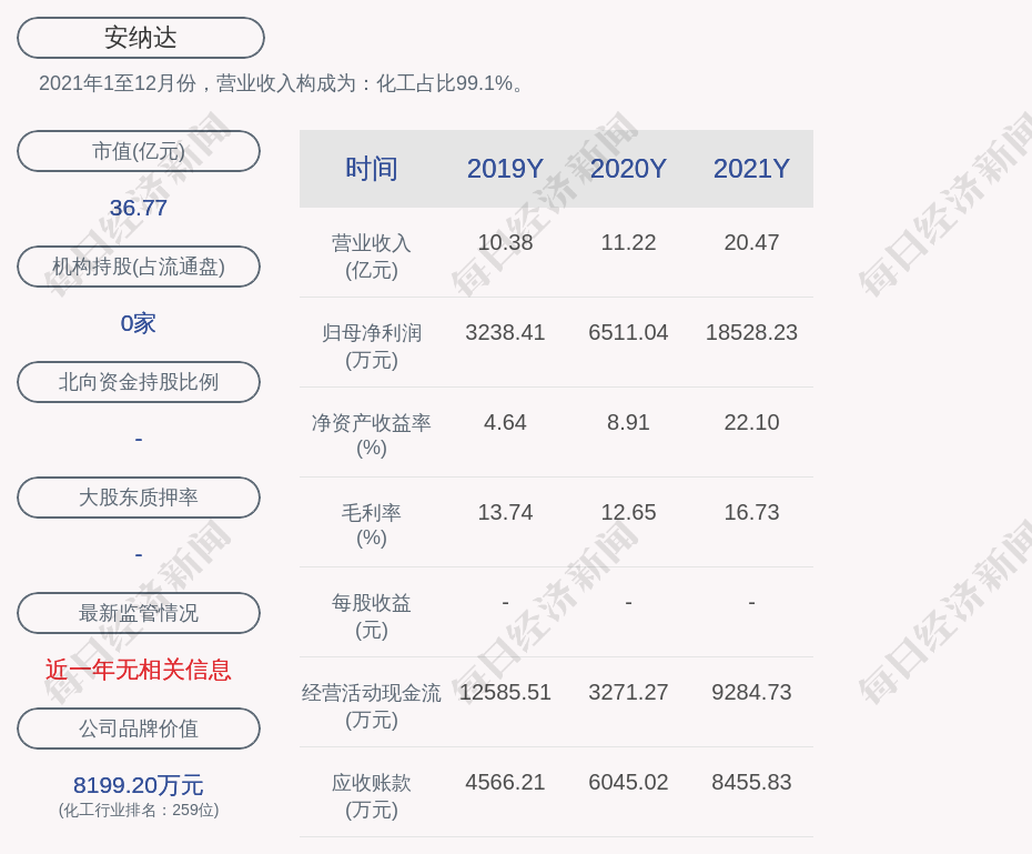 2021年1至12月份,安纳达的营业收入构成为:化工占比99.1%。