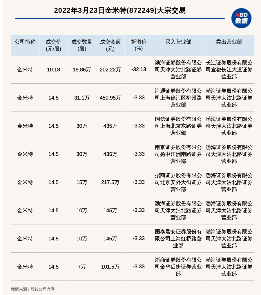 每经讯,2022年3月23日,新三板创新层公司金米特(872249)发生8笔大宗交易,折价率最高的一笔成交价10.18元/股,成交数量19.86万股,成交金额202.22万元,折价32.13%。买入营业部是渤海证券股份有限公司天津大沽北路证券营业部,卖出营业部是长江证券股份有限公司宜都长江大道证券营业部。