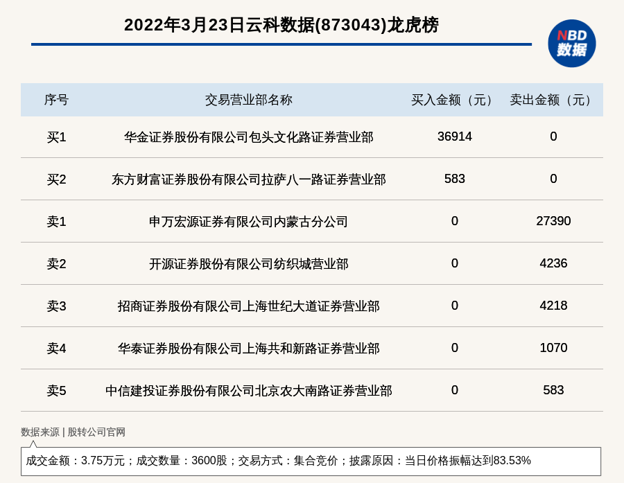每经讯,2022年3月23日,新三板创新层公司云科数据(873043)登上龙虎榜,交易方式是集合竞价,披露原因是当日价格振幅达到83.53%,成交数量3600股,成交金额3.75万元。买一席位为华金证券股份有限公司包头文化路证券营业部,买入3.69万元;卖一席位为申万宏源证券有限公司内蒙古分公司,卖出2.74万元。