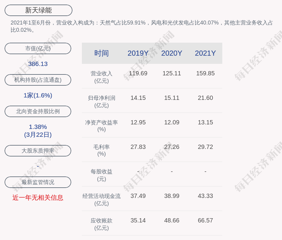 2021年1至6月份,新天绿能的营业收入构成为:天然气占比59.91%,风电和光伏发电占比40.07%,其他主营业务收入占比0.02%。