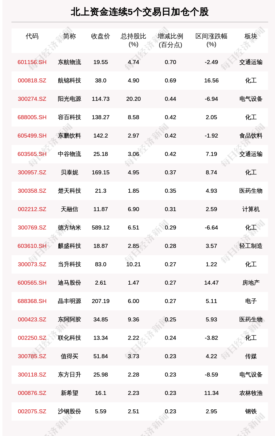 每经AI快讯,3月23日,北上资金连续5个交易日买入53个股。北上资金连续5个交易日加仓个股中,东航物流(601156.SH,收盘价:19.55元)增持比例增幅最大,5个交易日增持0.70个百分点,其他增持比例较大的个股包括航锦科技(000818.SZ,收盘价:38.0元)、阳光电源(300274.SZ,收盘价:114.73元)、容百科技(688005.SH,收盘价:138.27元),分别增持0.69个百分点、0.44个百分点、0.42个百分点。