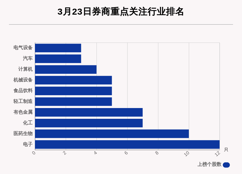 从券商对行业的关注度来看,券商关注个股数居前的行业分别是电子、医药生物、化工。