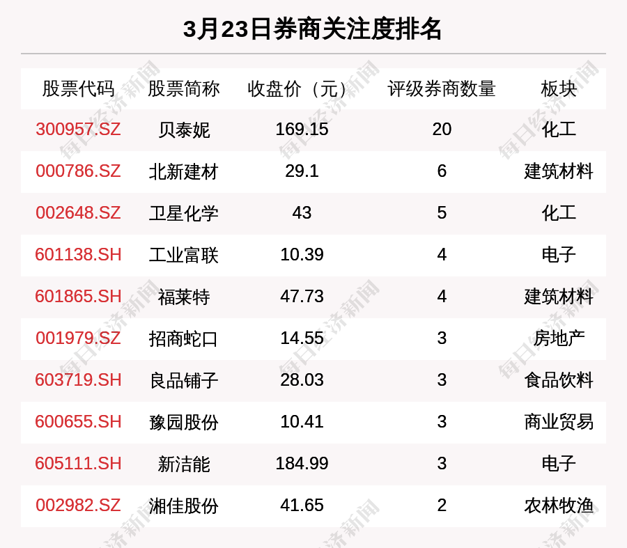 从券商对个股的关注程度来看,有22只个股获得多家券商关注,券商关注数量排名居前的个股是贝泰妮(300957.SZ)、北新建材(000786.SZ)、卫星化学(002648.SZ)。