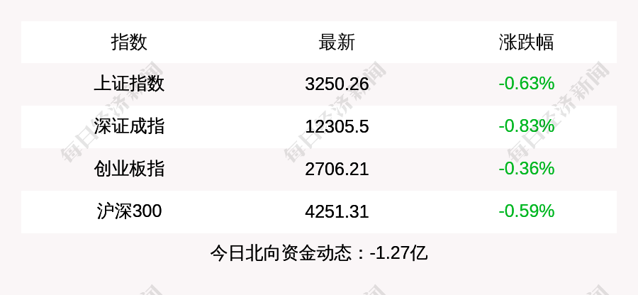 每经AI快讯:北京时间3月24日15:00,上证指数收盘下跌20.77点,跌幅为0.63%,报收3250.26点,成交额3907.28亿元;深证成指收盘下跌103.15点,跌幅为0.83%,报收12305.5点,成交额5293.62亿元;创业板指收盘下跌9.74点,跌幅为0.36%,报收2706.21点,成交额2013.39亿元;沪深300收盘下跌25.21点,跌幅为0.59%,报收4251.31点,成交额2195.94亿元。北上资金当日净流出1.27亿元。