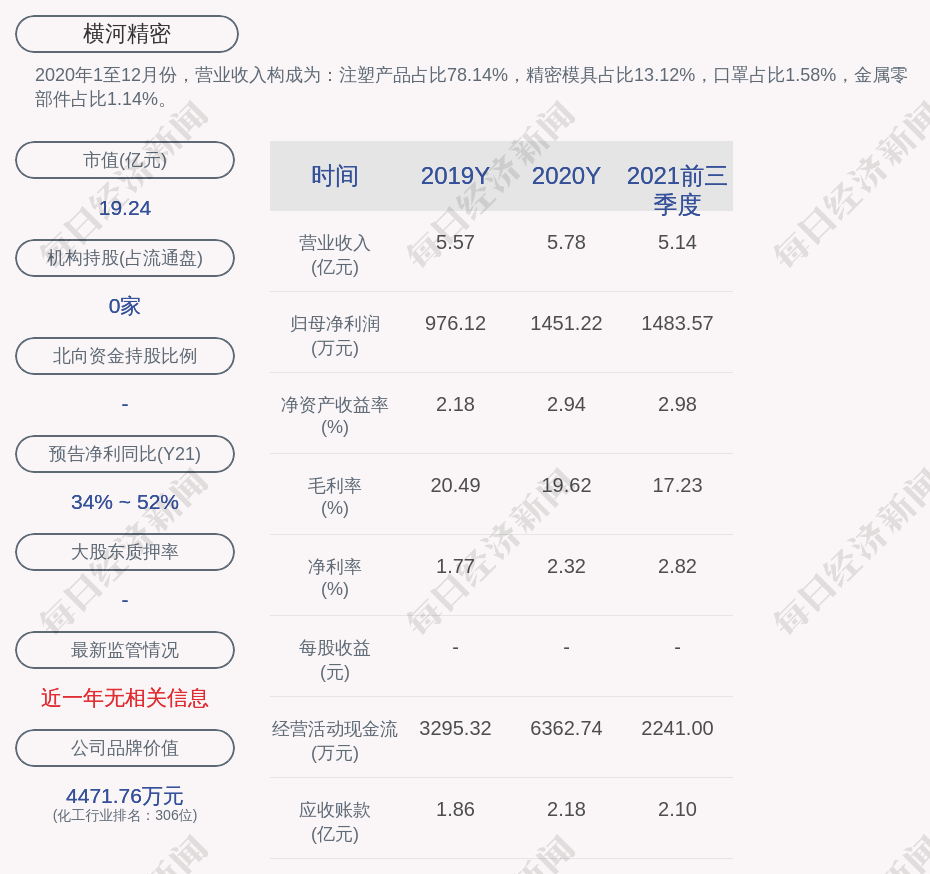 2020年1至12月份,横河精密的营业收入构成为:注塑产品占比78.14%,精密模具占比13.12%,口罩占比1.58%,金属零部件占比1.14%。