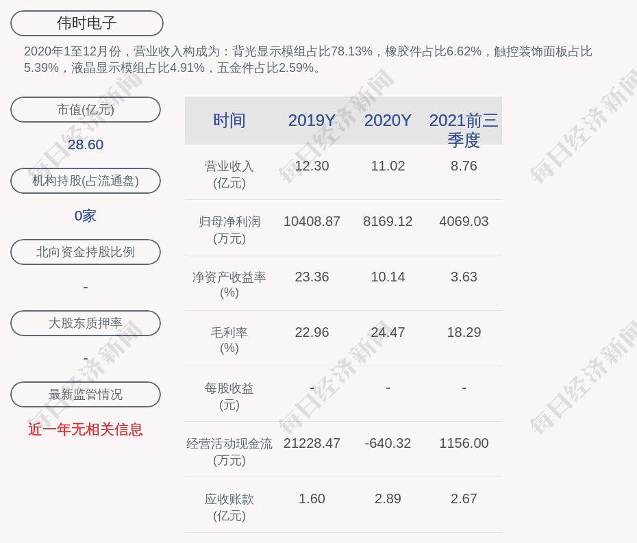 2020年1至12月份,伟时电子的营业收入构成为:背光显示模组占比78.13%,橡胶件占比6.62%,触控装饰面板占比5.39%,液晶显示模组占比4.91%,五金件占比2.59%。
