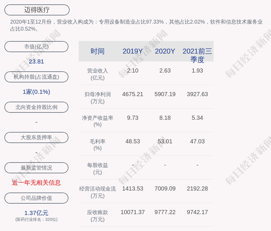 2020年1至12月份,迈得医疗的营业收入构成为:专用设备制造业占比97.33%,其他占比2.02%,软件和信息技术服务业占比0.52%。