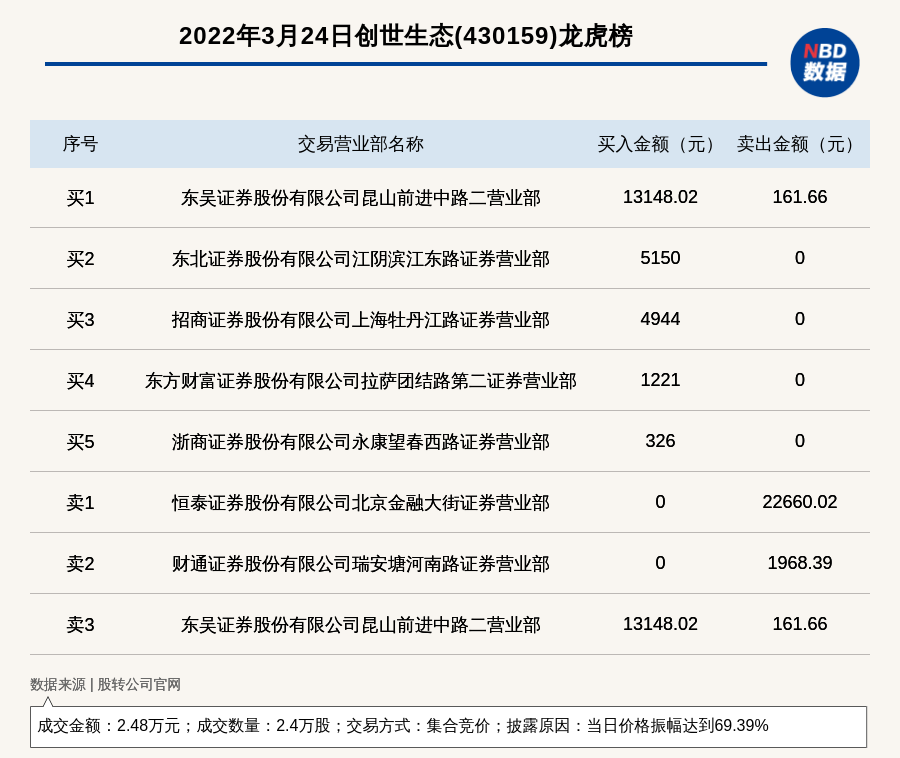 每经讯,2022年3月24日,新三板创新层公司创世生态(430159)登上龙虎榜,交易方式是集合竞价,披露原因是当日价格振幅达到69.39%,成交数量2.4万股,成交金额2.48万元。买一席位为东吴证券股份有限公司昆山前进中路二营业部,买入1.31万元;卖一席位为恒泰证券股份有限公司北京金融大街证券营业部,卖出2.27万元。