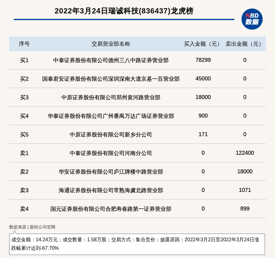 每经讯,2022年3月24日,新三板创新层公司瑞诚科技(836437)登上龙虎榜,交易方式是集合竞价,披露原因是2022年3月2日至2022年3月24日涨跌幅累计达到-67.70%,成交数量1.58万股,成交金额14.24万元。买一席位为中泰证券股份有限公司德州三八中路证券营业部,买入7.83万元;卖一席位为中泰证券股份有限公司河南分公司,卖出12.24万元。