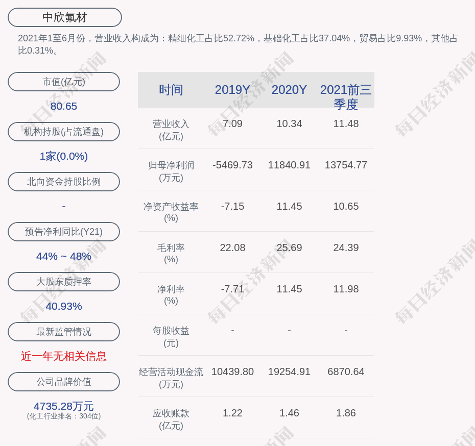 2021年1至6月份,中欣氟材的营业收入构成为:精细化工占比52.72%,基础化工占比37.04%,贸易占比9.93%,其他占比0.31%。