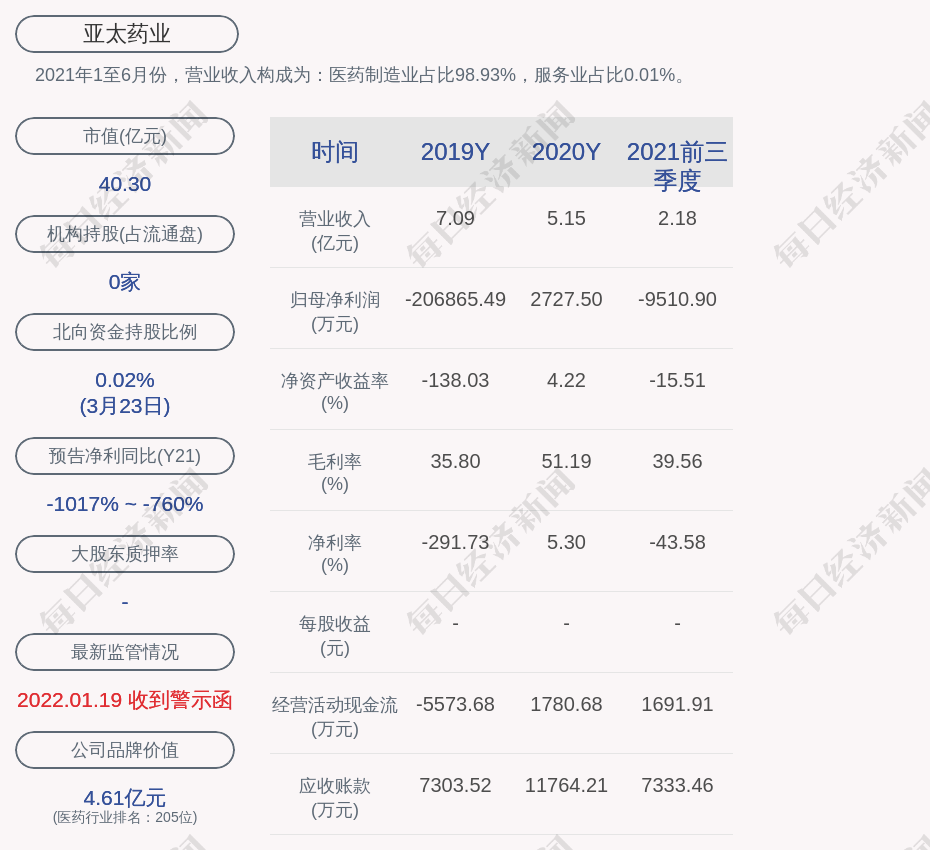 2021年1至6月份,亚太药业的营业收入构成为:医药制造业占比98.93%,服务业占比0.01%。