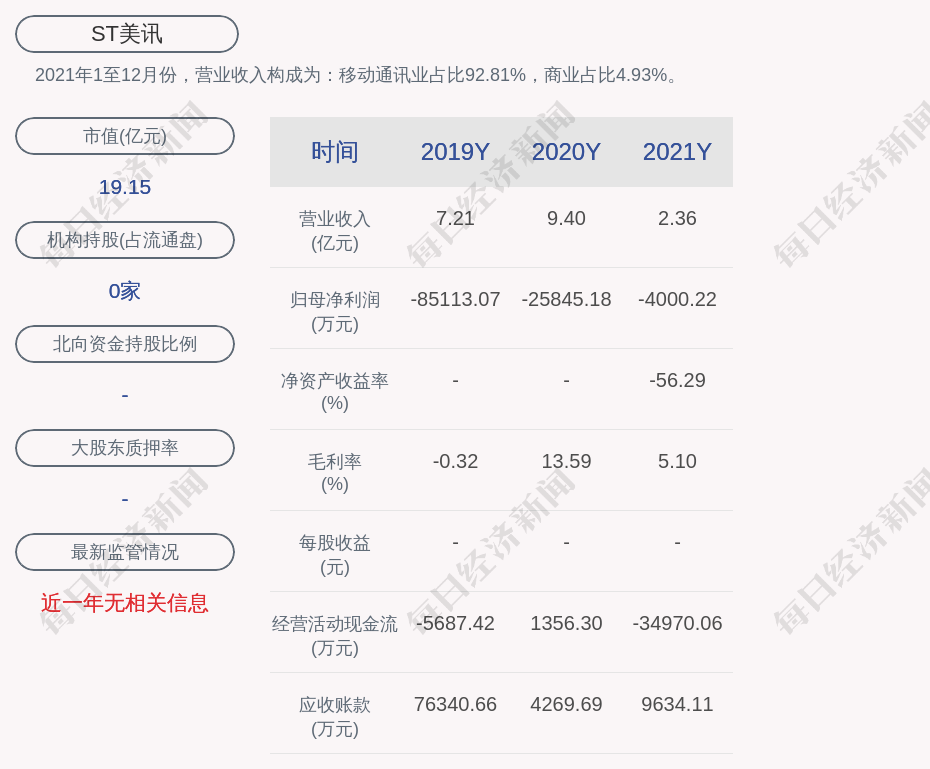 2021年1至12月份,ST美讯的营业收入构成为:移动通讯业占比92.81%,商业占比4.93%。