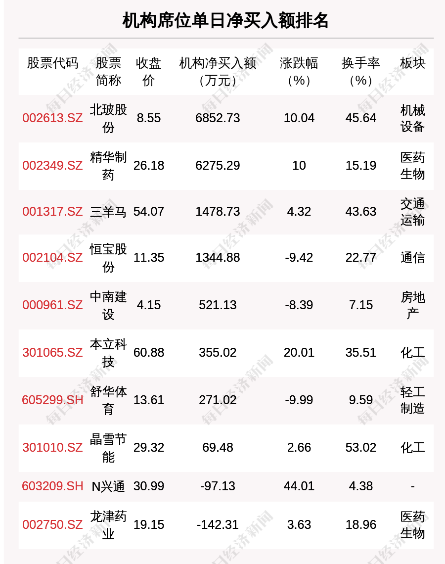 在龙虎榜中,涉及机构专用席位的个股有23只,净买入额前三的是北玻股份、精华制药、三羊马,分别为6852.73万元、6275.29万元、1478.73万元。