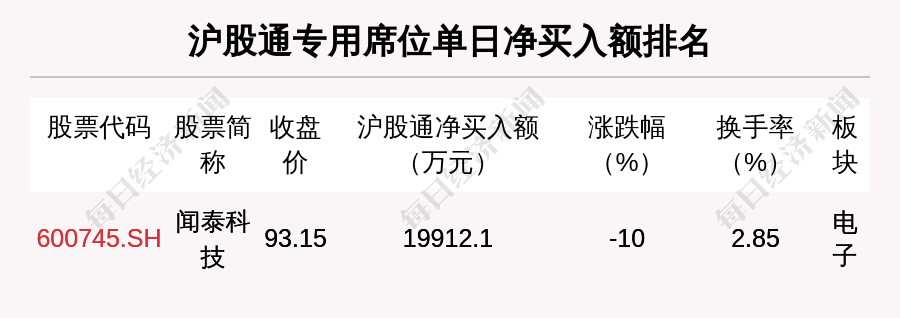 在龙虎榜中,涉及沪股通专用席位的个股有1只,闻泰科技的沪股通专用席位净买入额最大,净买入1.99亿元。