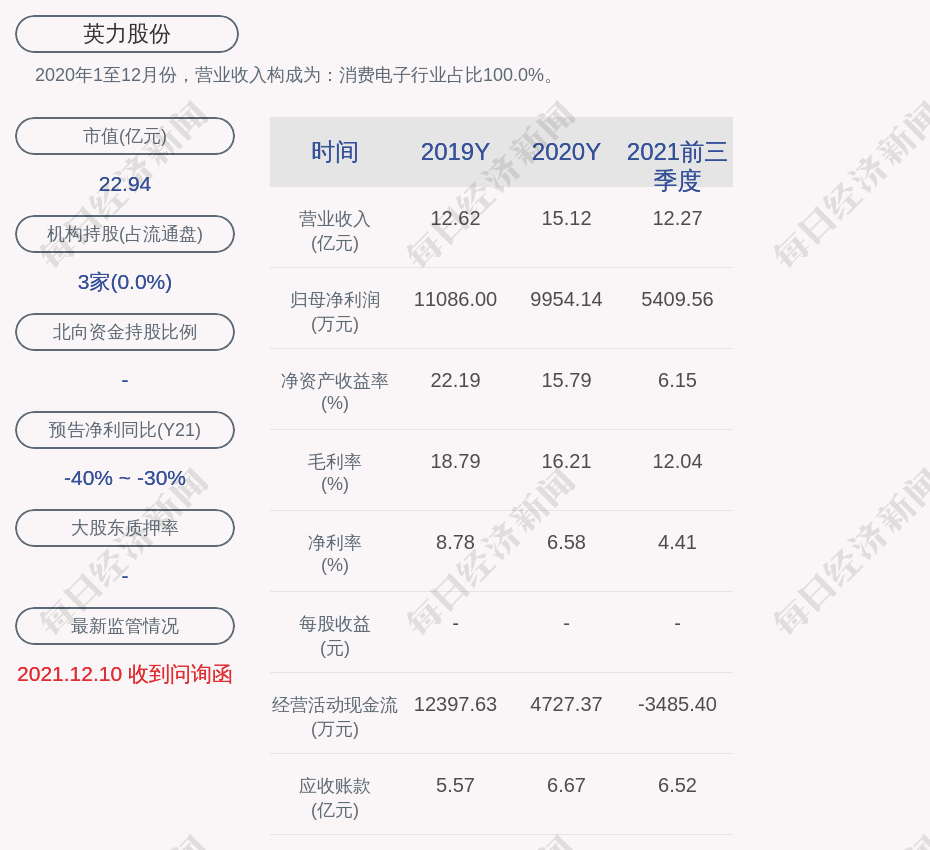 2020年1至12月份,英力股份的营业收入构成为:消费电子行业占比100.0%。