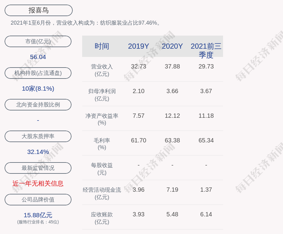 2021年1至6月份,报喜鸟的营业收入构成为:纺织服装业占比97.46%。