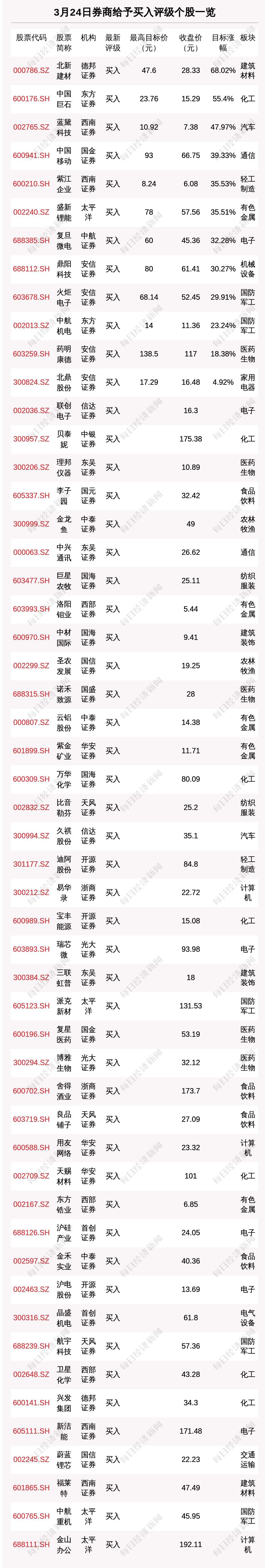 每经AI快讯,3月24日,券商给予评级的个股数共有68只,获得买入评级的个股数共有53只。在公布了目标价格的12只个股中,按照最新收盘价计算,预期涨幅排名居前的个股是北新建材(000786.SZ)、中国巨石(600176.SH)、蓝黛科技(002765.SZ),预期涨幅分别是68.02%、55.4%、47.97%。