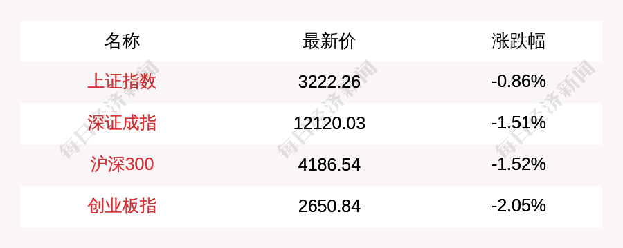 截至北京时间14:30,上证指数报3222.26点,跌0.86%,深证成指报12120.03点,跌1.51%,沪深300报4186.54点,跌1.52%,创业板指报2650.84点,跌2.05%