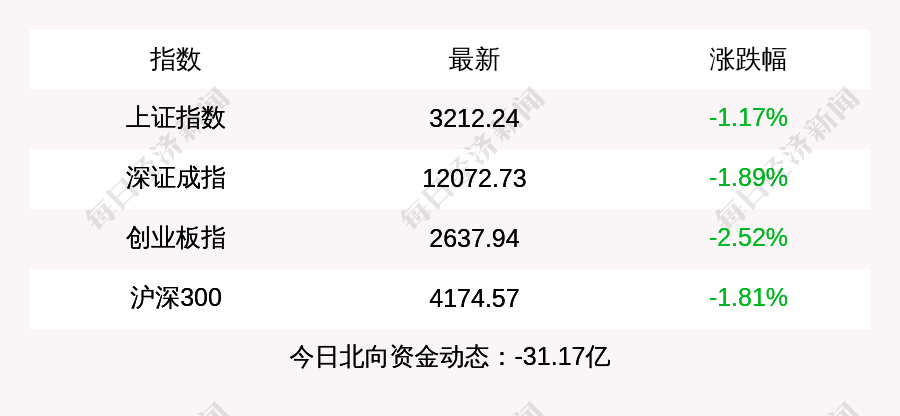 每经AI快讯:北京时间3月25日15:00,上证指数收盘下跌38.02点,跌幅为1.17%,报收3212.24点,成交额3897.7亿元;深证成指收盘下跌232.77点,跌幅为1.89%,报收12072.73点,成交额5284.92亿元;创业板指收盘下跌68.27点,跌幅为2.52%,报收2637.94点,成交额1939.72亿元;沪深300收盘下跌76.74点,跌幅为1.81%,报收4174.57点,成交额2170.13亿元。北上资金当日净流出31.17亿元。