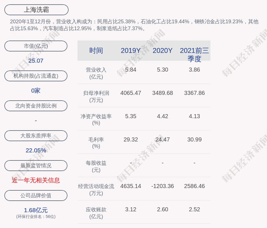2020年1至12月份,上海洗霸的营业收入构成为:民用占比25.38%,石油化工占比19.44%,钢铁冶金占比19.23%,其他占比15.63%,汽车制造占比12.95%,制浆造纸占比7.37%。