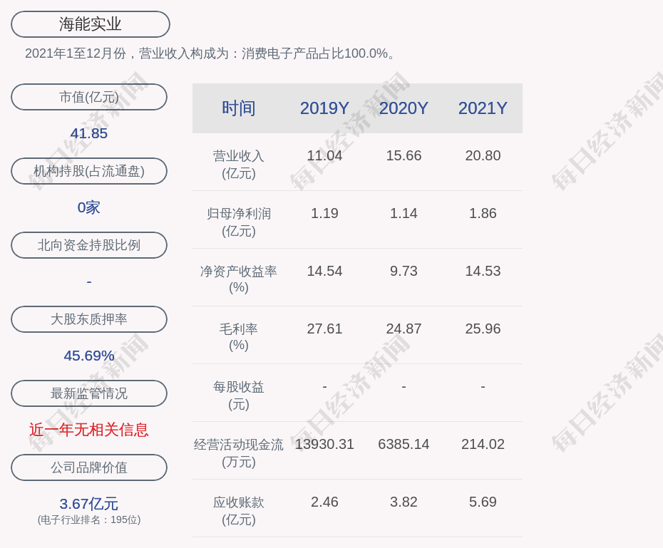 2021年1至12月份,海能实业的营业收入构成为:消费电子产品占比100.0%。