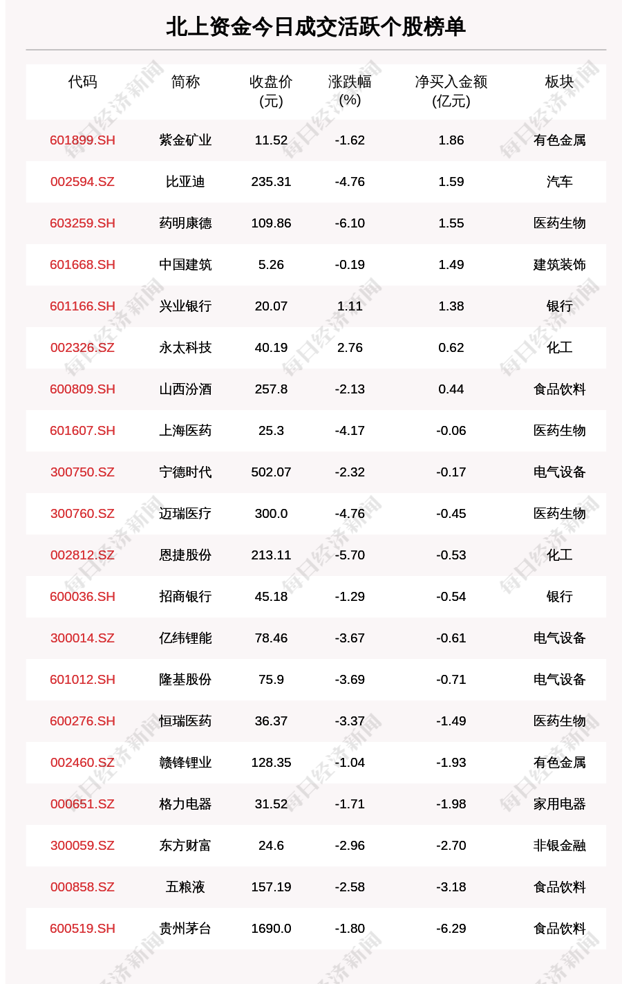 3月25日,北上资金成交活跃个股榜单中,净买入个股共7只,金额最多的是紫金矿业(601899.SH,收盘价:11.52元),净买入1.865亿元;净卖出个股共13只,金额最多的是贵州茅台(600519.SH,收盘价:1690.0元),净卖出6.294亿元。