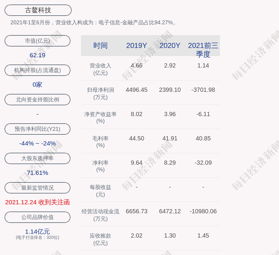 2021年1至6月份,古鳌科技的营业收入构成为:电子信息-金融产品占比94.27%。