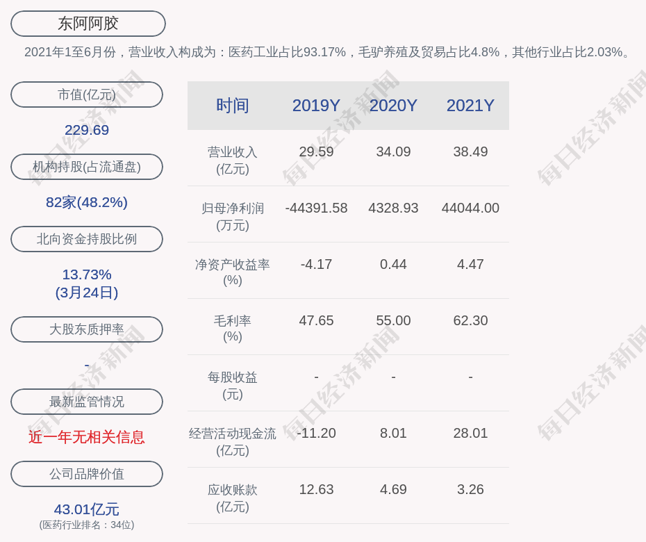 每经AI快讯,东阿阿胶(SZ 000423,收盘价:35.12元)3月25日晚间发布年度业绩报告称,2021年营业收入约38.49亿元,同比增加12.89%;归属于上市公司股东的净利润盈利约4.4亿元,同比增加917.43%;基本每股收益盈利0.68元,同比增加871.43%。分配方案为:拟每10股派发现金红利6.5元(含税)、不送红股、不转增。