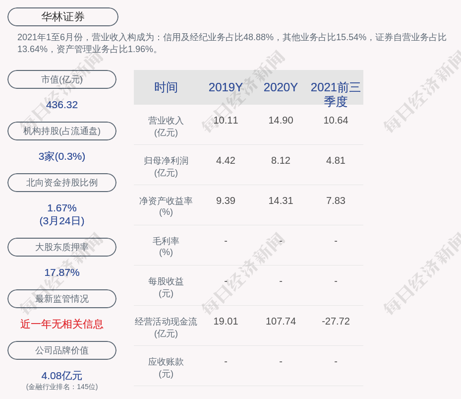 2021年1至6月份,华林证券的营业收入构成为:信用及经纪业务占比48.88%,其他业务占比15.54%,证券自营业务占比13.64%,资产管理业务占比1.96%。