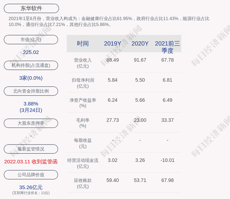 2021年1至6月份,东华软件的营业收入构成为:金融健康行业占比61.95%,政府行业占比11.43%,能源行业占比10.0%,通信行业占比7.21%,其他行业占比5.86%。
