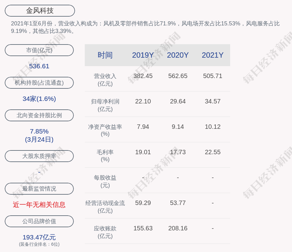 每经AI快讯,金风科技(SZ 002202,收盘价:13.44元)3月25日晚间发布年度业绩报告称,2021年营业收入约505.71亿元,同比减少10.12%;归属于上市公司股东的净利润盈利约34.57亿元,同比增加16.65%;基本每股收益盈利0.7887元,同比增加17.16%。分配方案为:拟每10股派发现金红利2.5元(含税)、不送红股、不转增。
