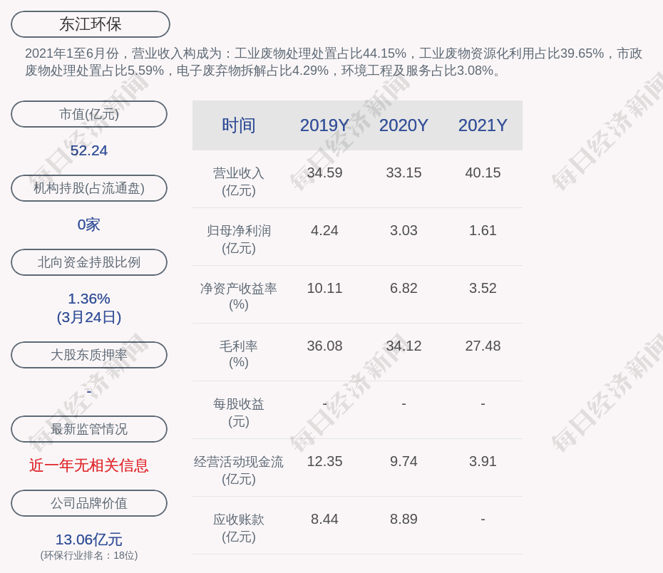 2021年1至6月份,东江环保的营业收入构成为:工业废物处理处置占比44.15%,工业废物资源化利用占比39.65%,市政废物处理处置占比5.59%,电子废弃物拆解占比4.29%,环境工程及服务占比3.08%。