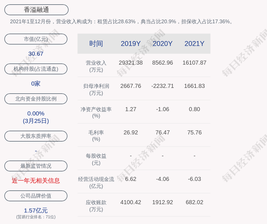 2021年1至12月份,香溢融通的营业收入构成为:租赁占比28.63%,典当占比20.9%,担保收入占比17.36%。