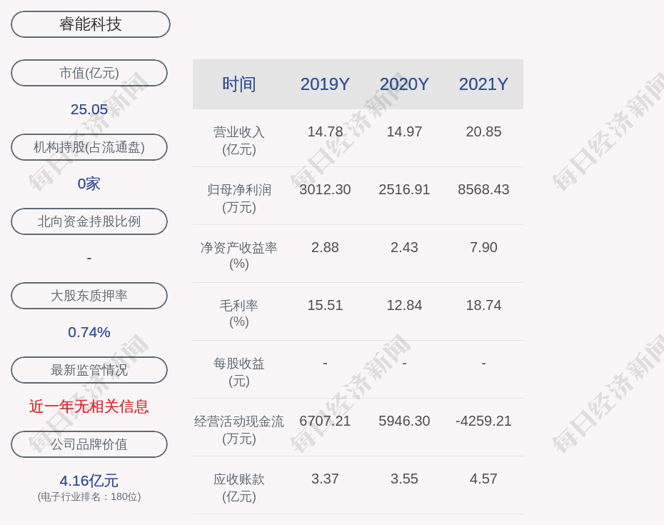 每经AI快讯,睿能科技(SH 603933,收盘价:11.88元)3月26日发布年度业绩报告称,2021年营业收入约20.85亿元,同比增加39.3%;归属于上市公司股东的净利润盈利约8568万元,同比增加240.44%;基本每股收益盈利0.4258元,同比增加240.37%。分配方案为:拟每10股派发现金股利人民币1.3元(含税)、不送红股、不转增。