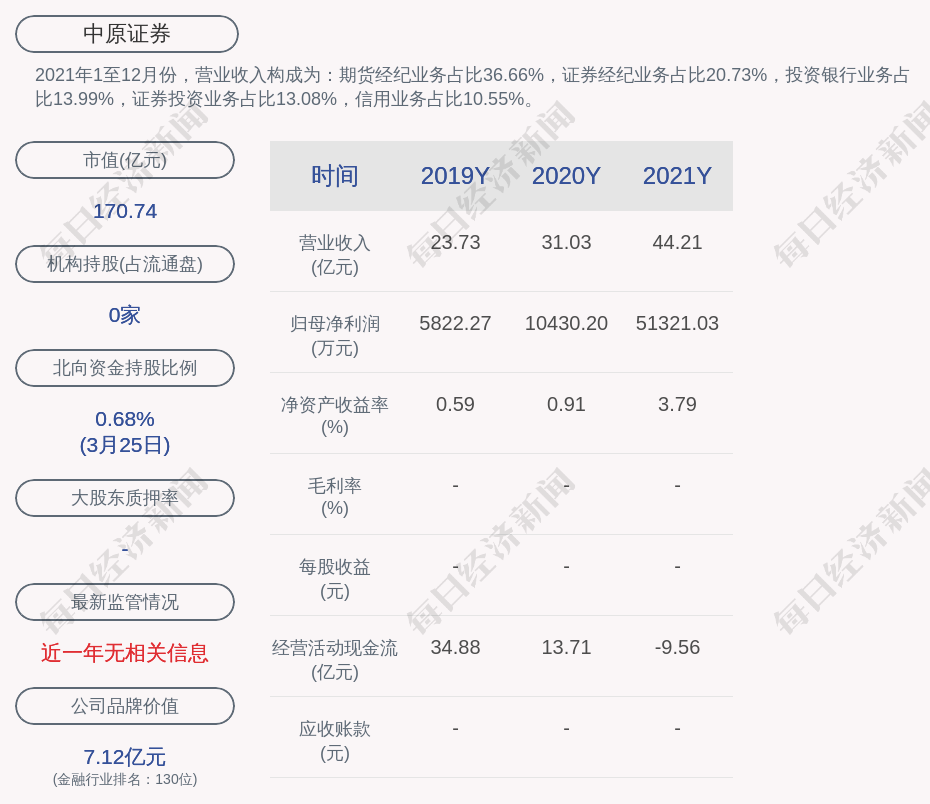 每经AI快讯,中原证券(SH 601375,收盘价:4.56元)3月26日发布年度业绩报告称,2021年营业收入约44.21亿元,同比增加42.46%;归属于上市公司股东的净利润盈利约5.13亿元,同比增加392.04%;基本每股收益盈利0.11元,同比增加450%。分配方案为:拟每10股派发现金红利人民币0.21元(含税)、不送红股、不转增。