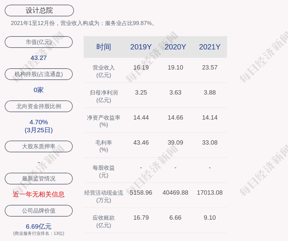 每经AI快讯,设计总院(SH 603357,收盘价:9.52元)3月26日发布年度业绩报告称,2021年营业收入约23.57亿元,同比增加23.41%;归属于上市公司股东的净利润盈利约3.88亿元,同比增加6.9%;基本每股收益盈利0.85元,同比增加6.25%。分配方案为:拟每10股派发现金红利4.6元(含税)、不送红股、不转增。