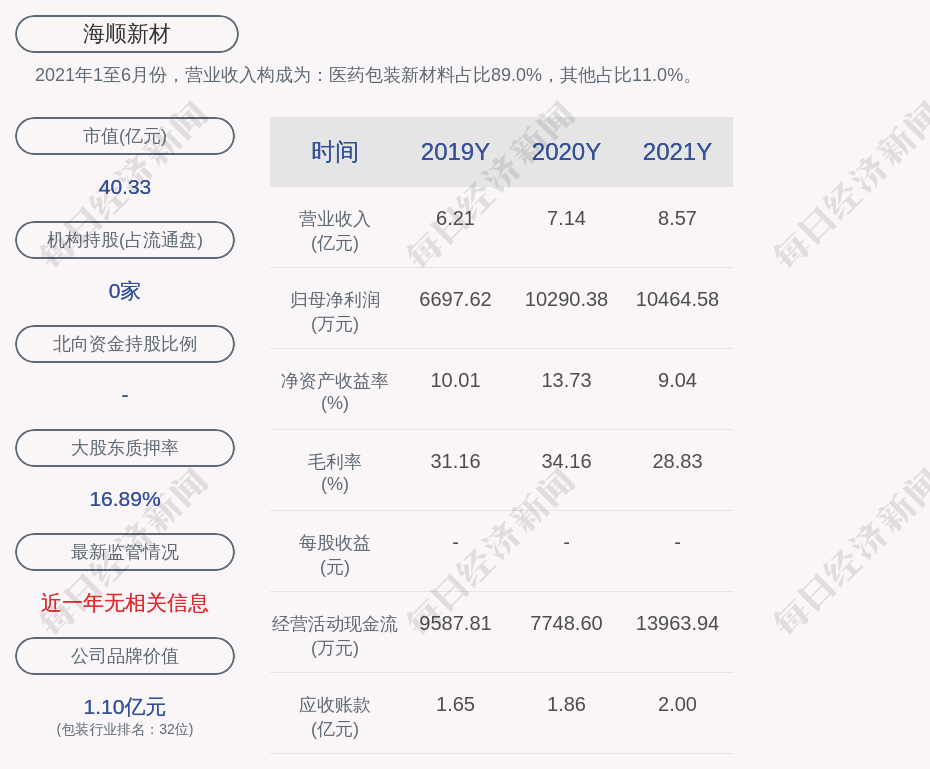 2021年1至6月份,海顺新材的营业收入构成为:医药包装新材料占比89.0%,其他占比11.0%。