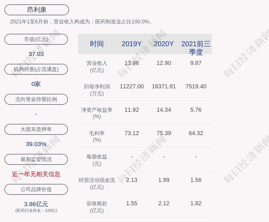 2021年1至6月份,昂利康的营业收入构成为:医药制造业占比100.0%。