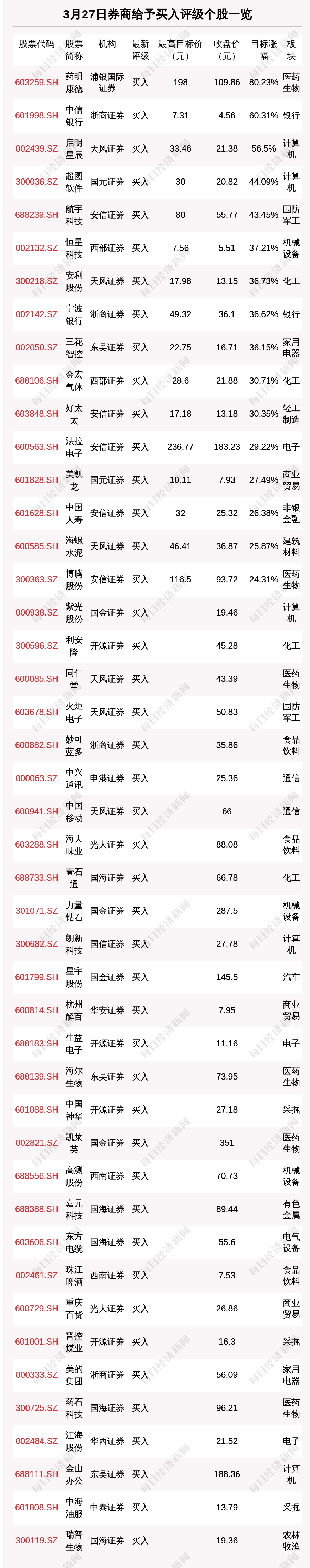 每经AI快讯,3月27日,券商给予评级的个股数共有52只,获得买入评级的个股数共有45只。在公布了目标价格的16只个股中,按照最新收盘价计算,预期涨幅排名居前的个股是药明康德(603259.SH)、中信银行(601998.SH)、启明星辰(002439.SZ),预期涨幅分别是80.23%、60.31%、56.5%。